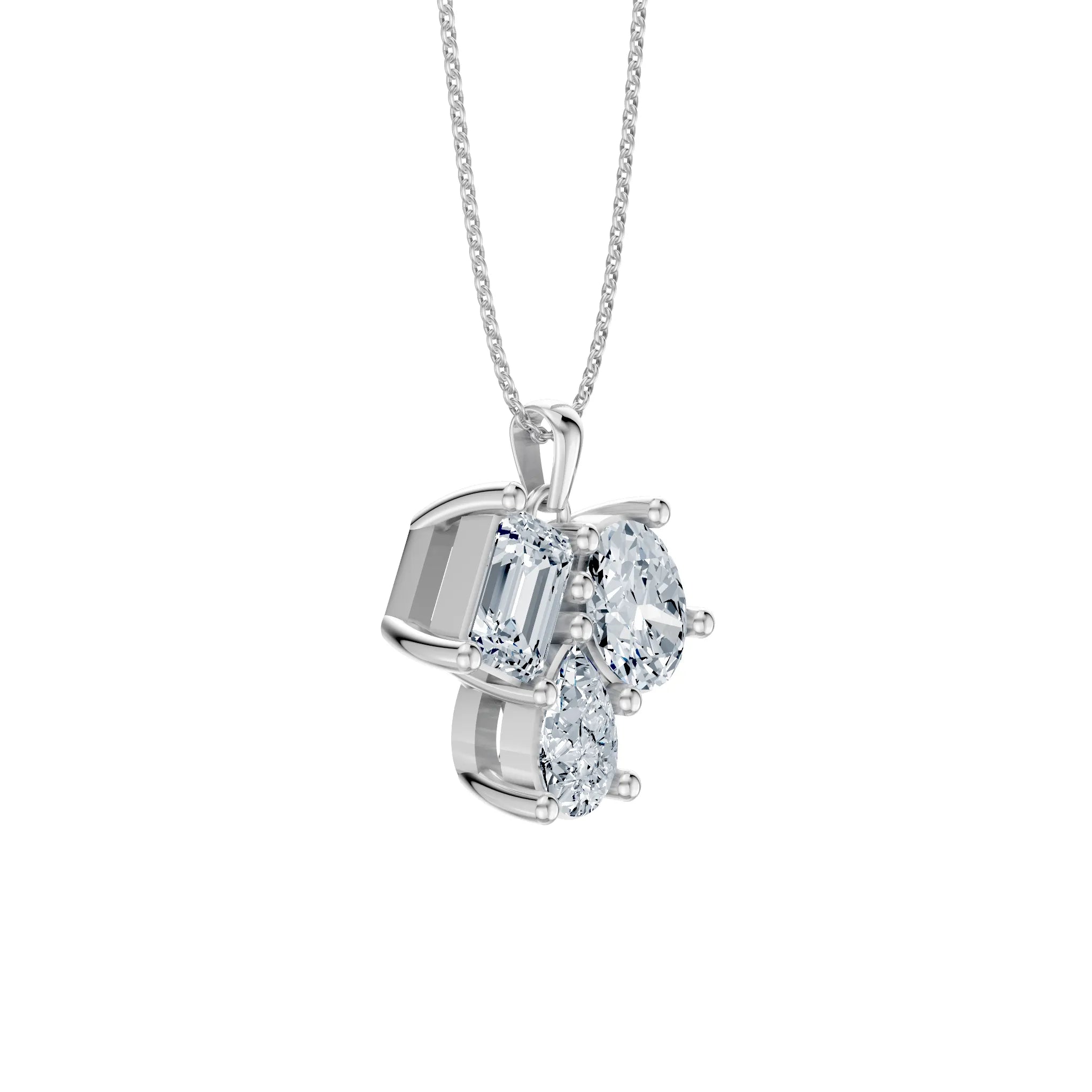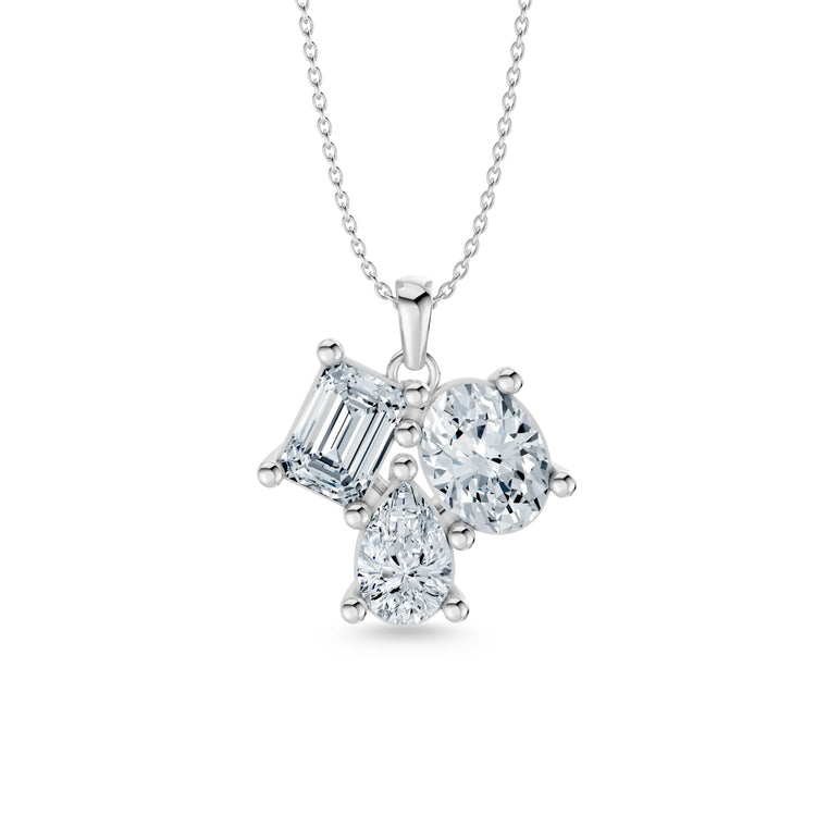 Dieses außergewöhnliche Collier vereint die Kraft dreier ikonischer Schliffe in einem harmonischen Ensemble. Ein ovaler, ein tropfenförmiger und ein emerald-geschliffener Labordiamant bilden gemeinsam eine Komposition aus Licht, Bewegung und Charakter – eingefasst in feinstes 14 Karat (585er) Weißgold.
