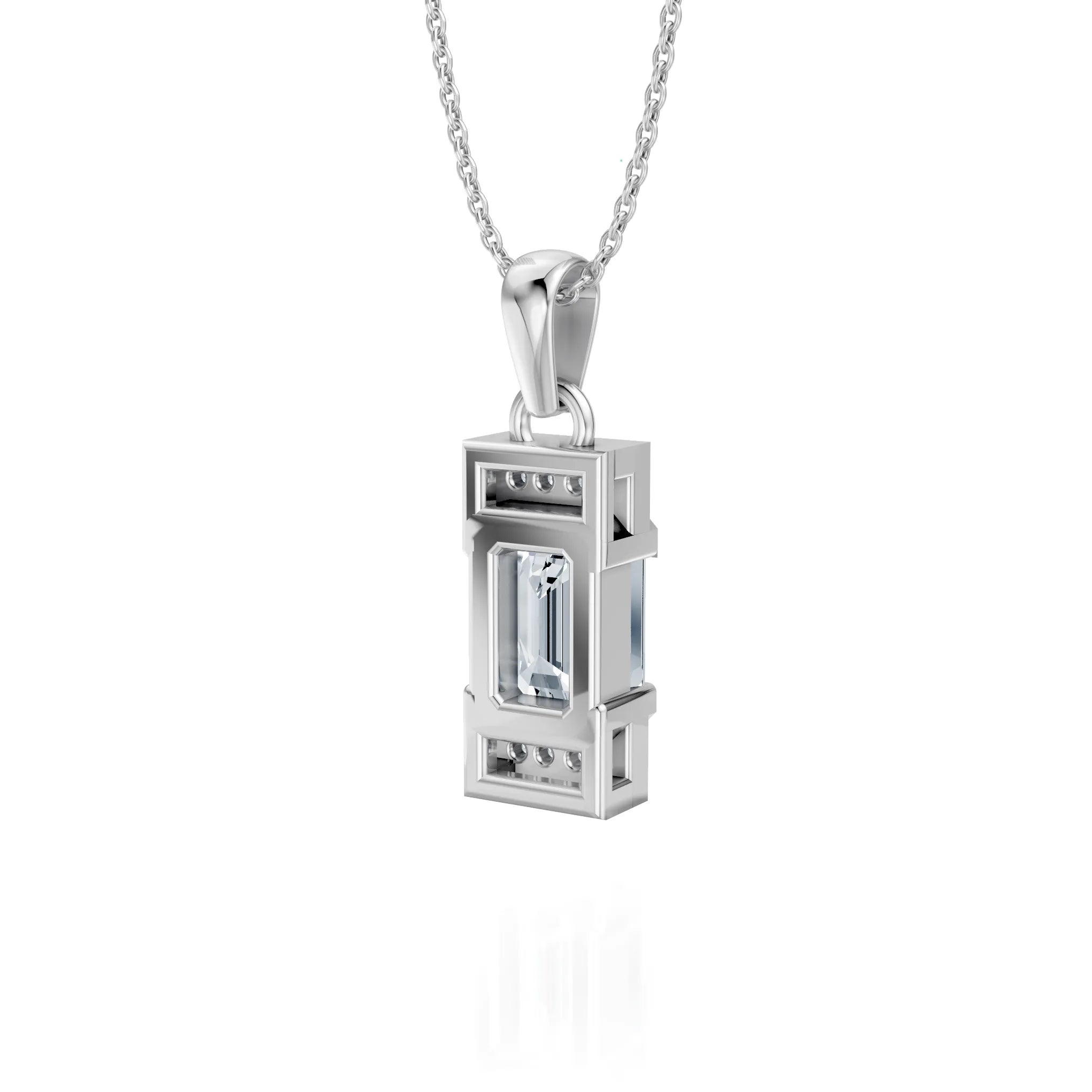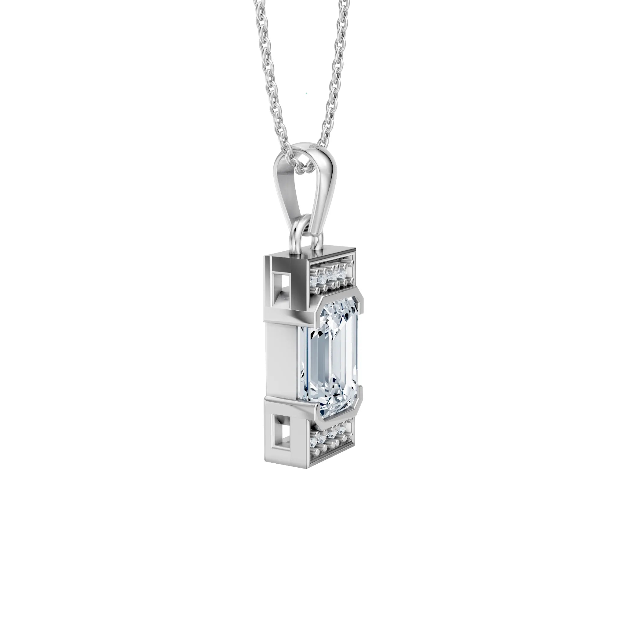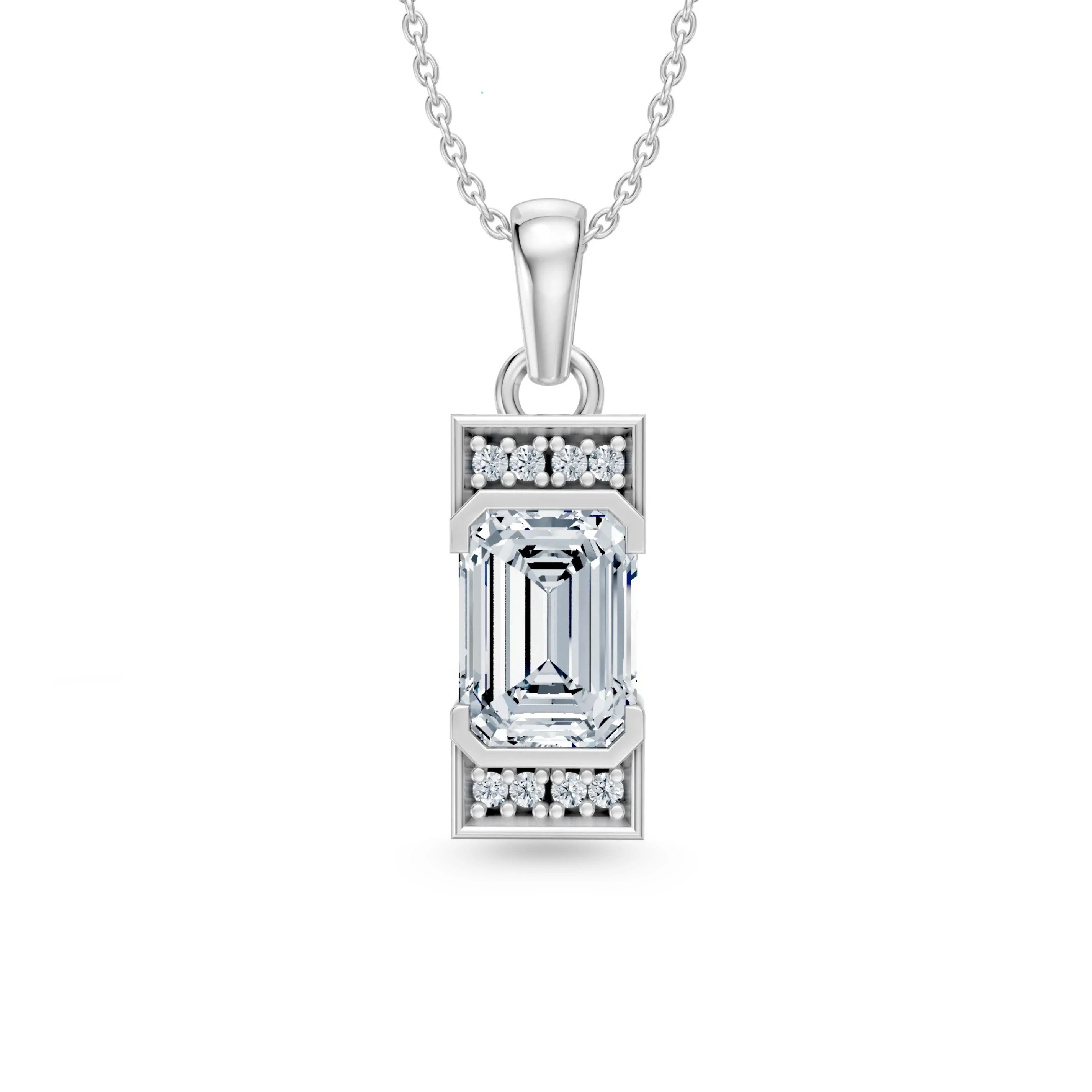 Diese Halskette bringt Klarheit, Struktur und Eleganz in vollkommene Balance. Im Mittelpunkt steht ein rechteckiger Labordiamant im ikonischen Emerald-Cut – präzise geschliffen, um Tiefe und Spiegelung in jedem Lichtwinkel zu entfalten. Der Diamant wird von zwei Reihen feiner Pavé-Diamanten eingefasst, die das Design grafisch rahmen und seine Linienführung unterstreichen – alles in edlem 14 Karat (585er) Weißgold.