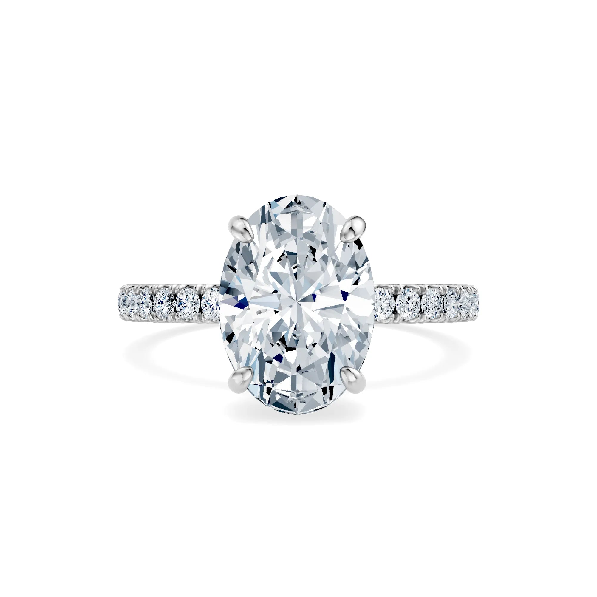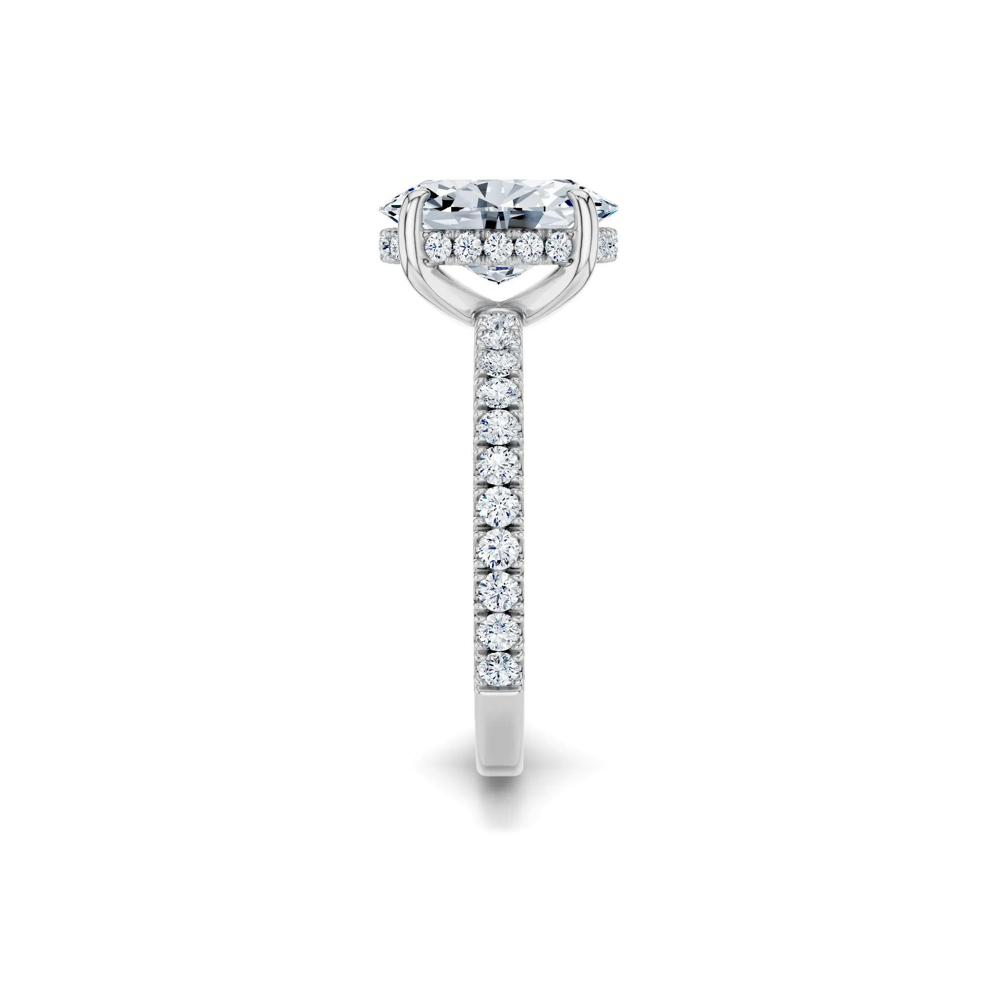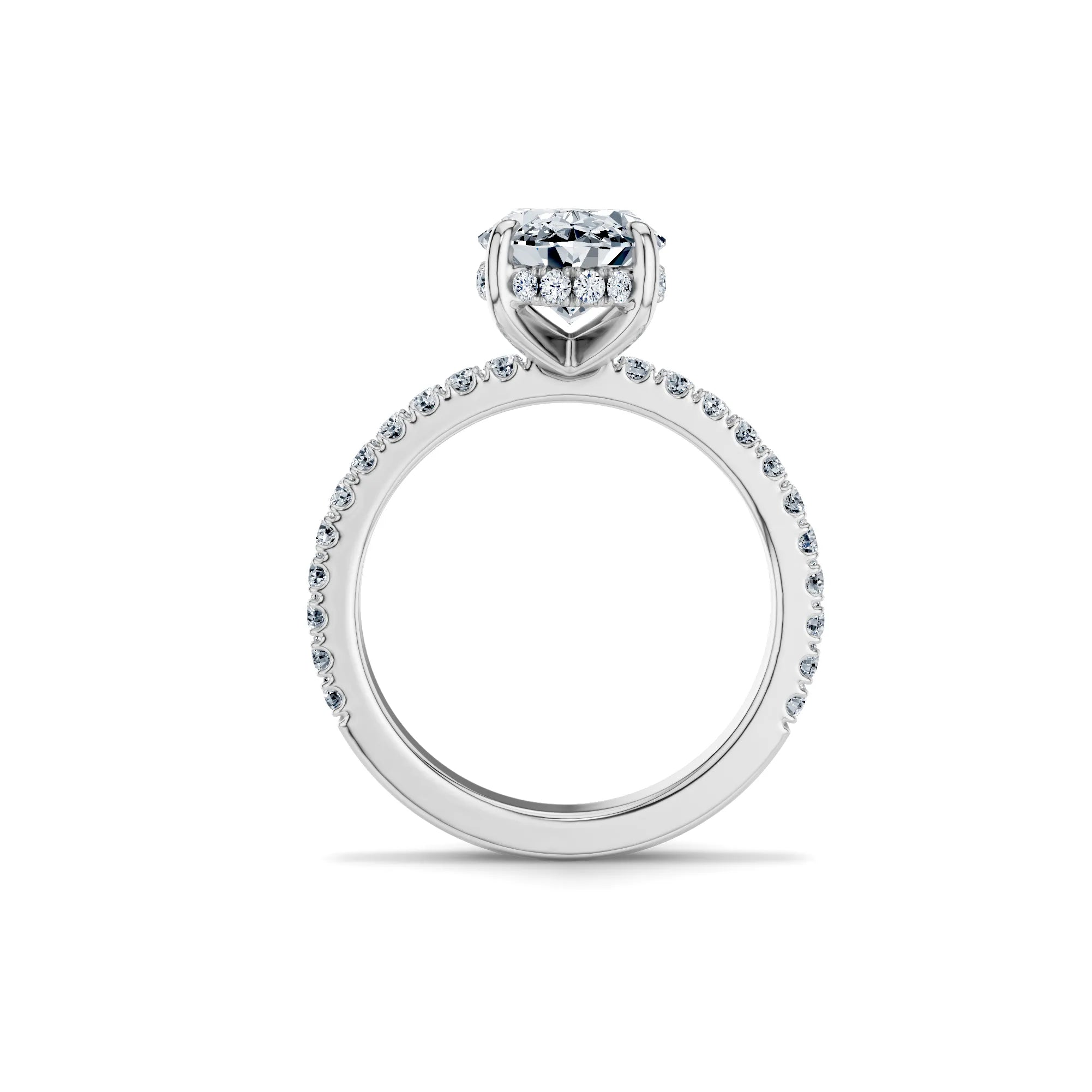 Zeitlose Eleganz und moderne Raffinesse vereinen sich im Classic Hidden Halo Pavé Verlobungsring. Der oval geschliffene Labordiamant steht im Mittelpunkt und wird von einem dezenten, versteckten Halo unter dem Stein umrahmt – ein verborgenes Detail mit strahlender Wirkung.