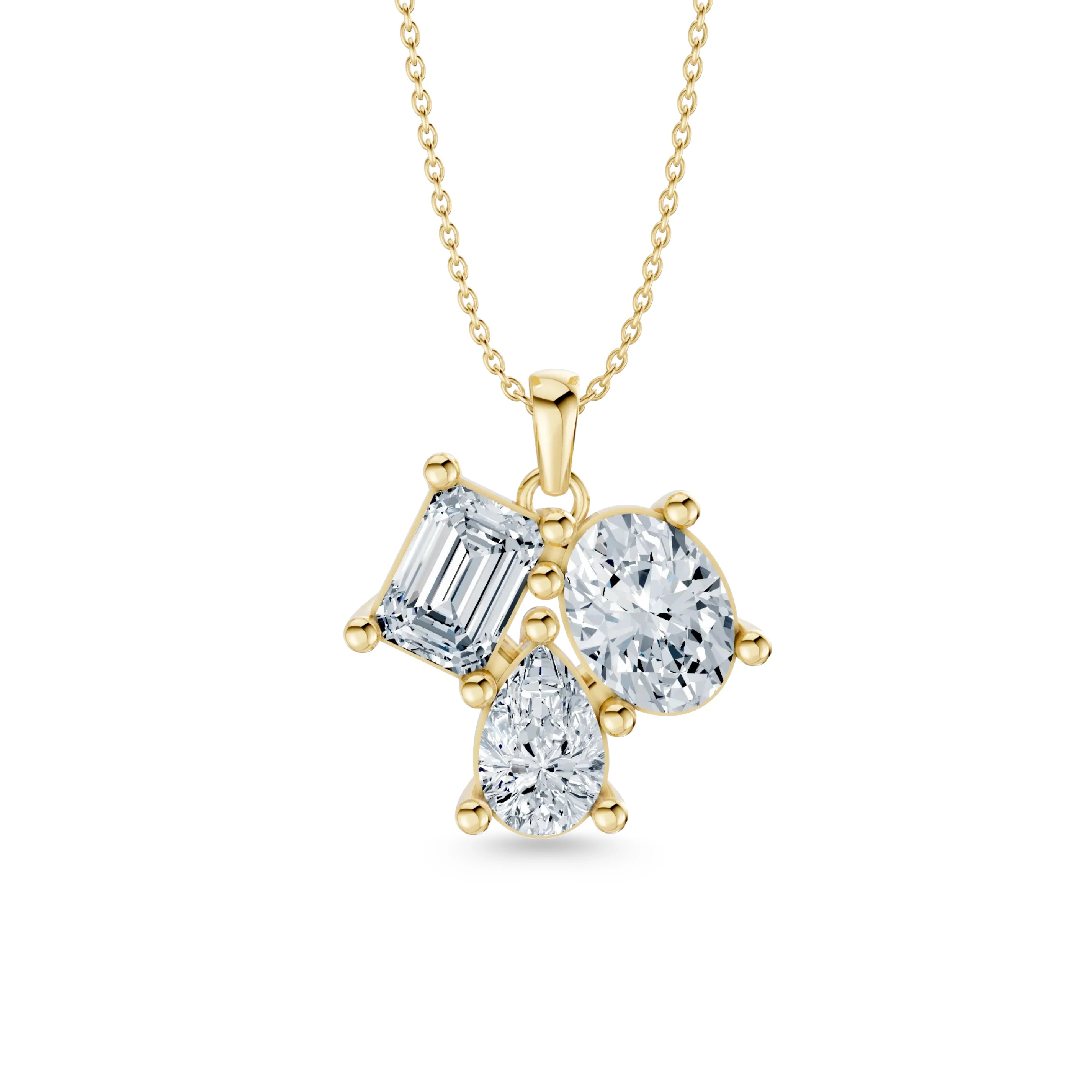 Dieses außergewöhnliche Collier vereint die Kraft dreier ikonischer Schliffe in einem harmonischen Ensemble. Ein ovaler, ein tropfenförmiger und ein emerald-geschliffener Labordiamant bilden gemeinsam eine Komposition aus Licht, Bewegung und Charakter – eingefasst in feinstes 14 Karat (585er) Gelbgold.