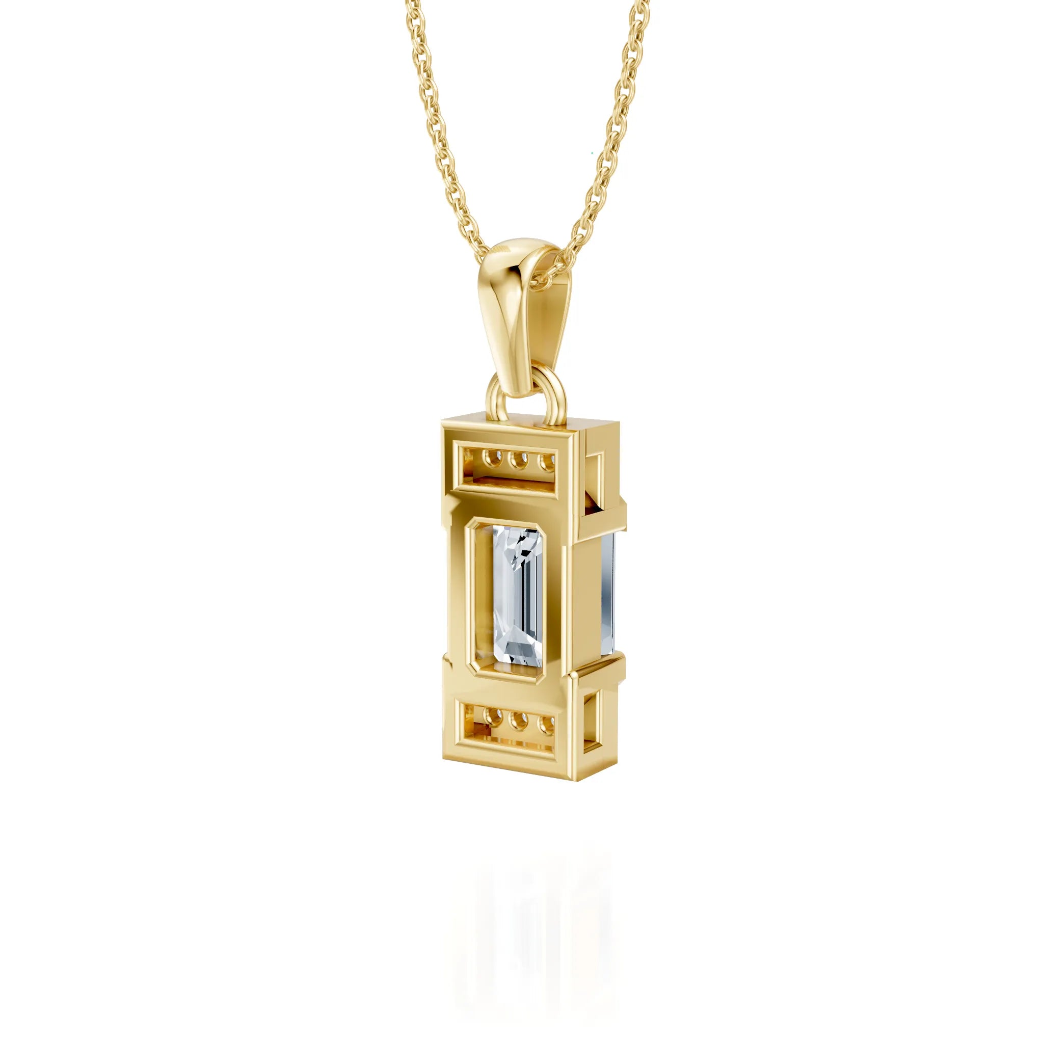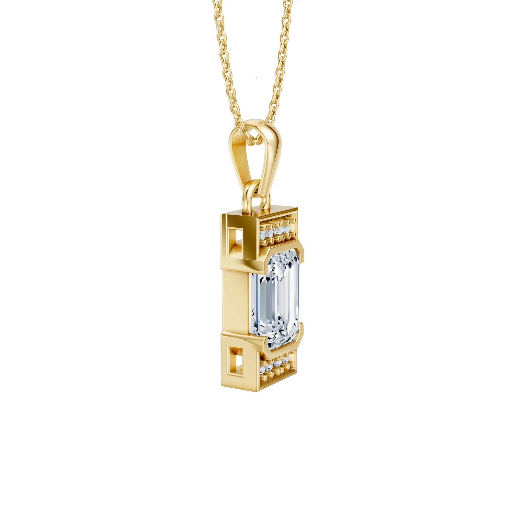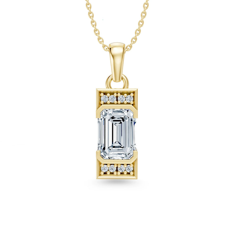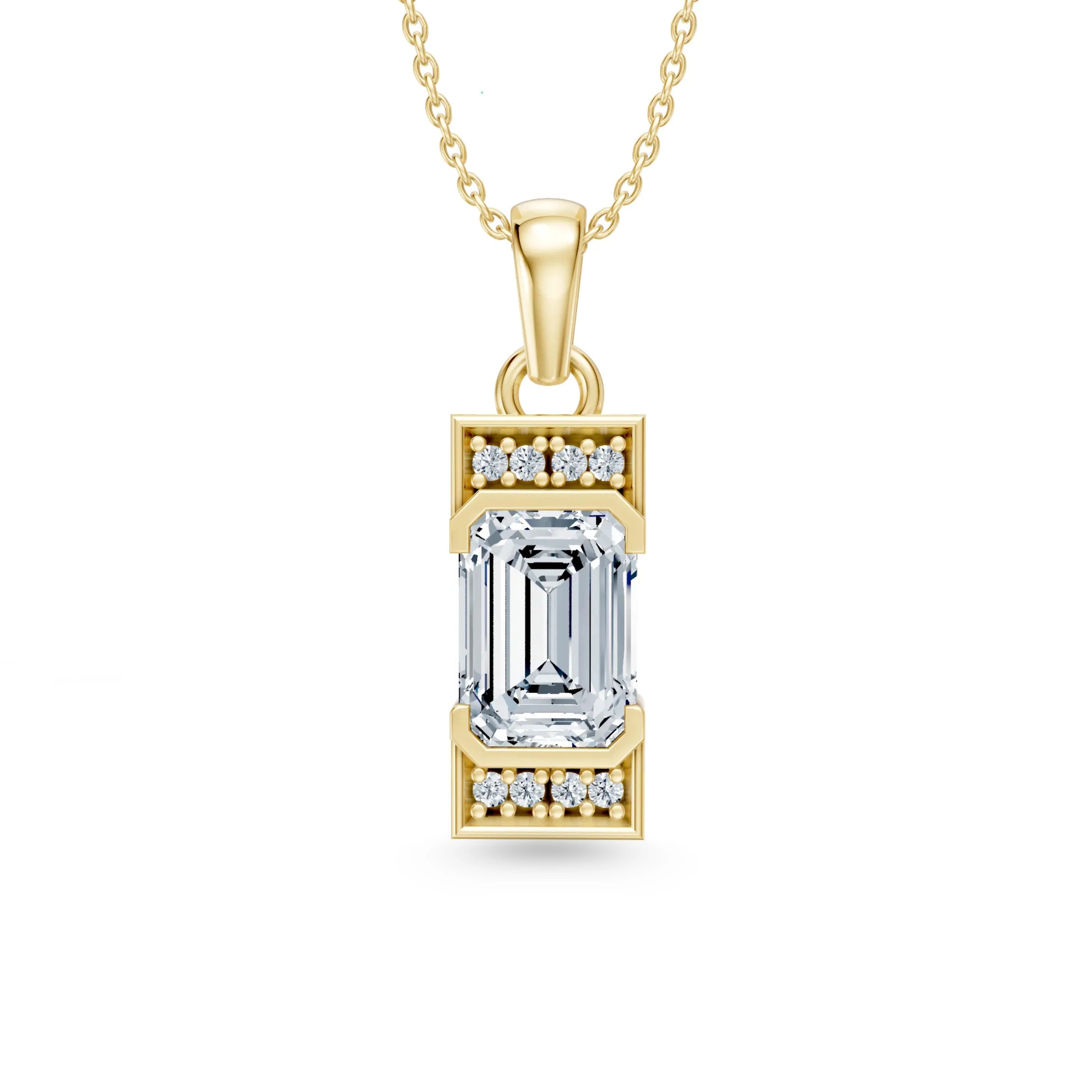Diese Halskette bringt Klarheit, Struktur und Eleganz in vollkommene Balance. Im Mittelpunkt steht ein rechteckiger Labordiamant im ikonischen Emerald-Cut – präzise geschliffen, um Tiefe und Spiegelung in jedem Lichtwinkel zu entfalten. Der Diamant wird von zwei Reihen feiner Pavé-Diamanten eingefasst, die das Design grafisch rahmen und seine Linienführung unterstreichen – alles in edlem 14 Karat (585er) Gelbgold.