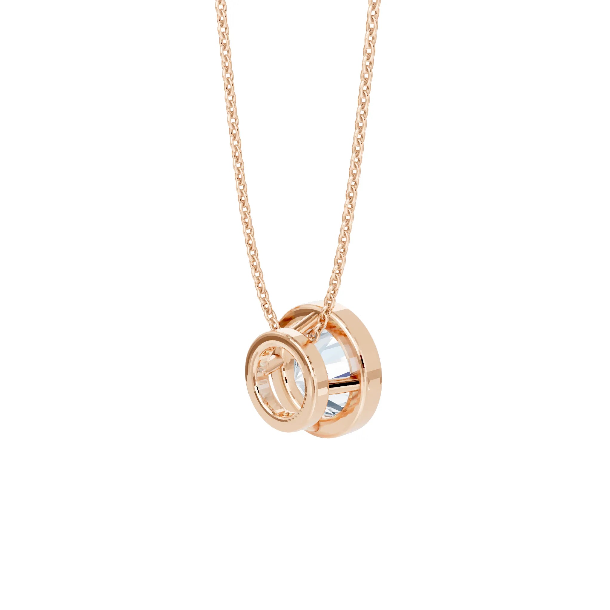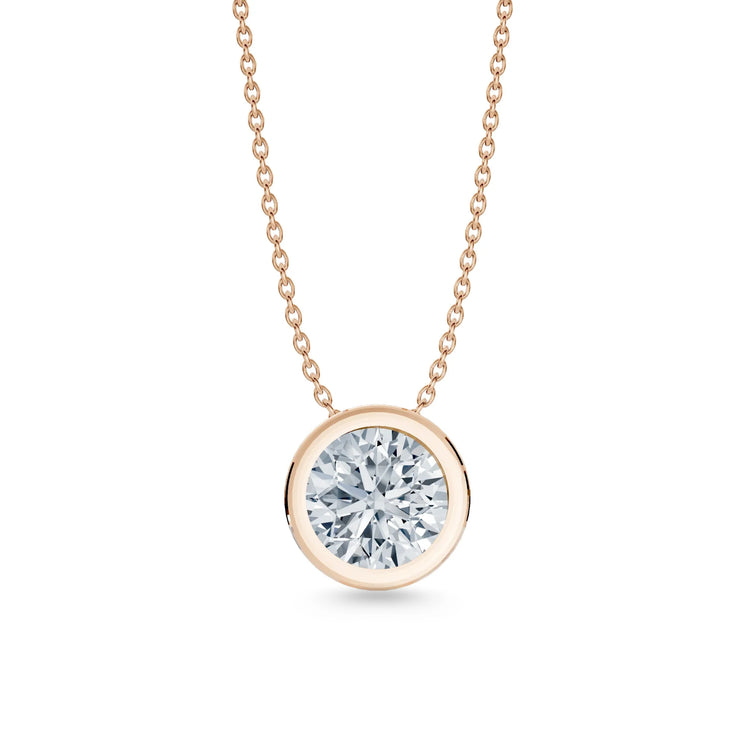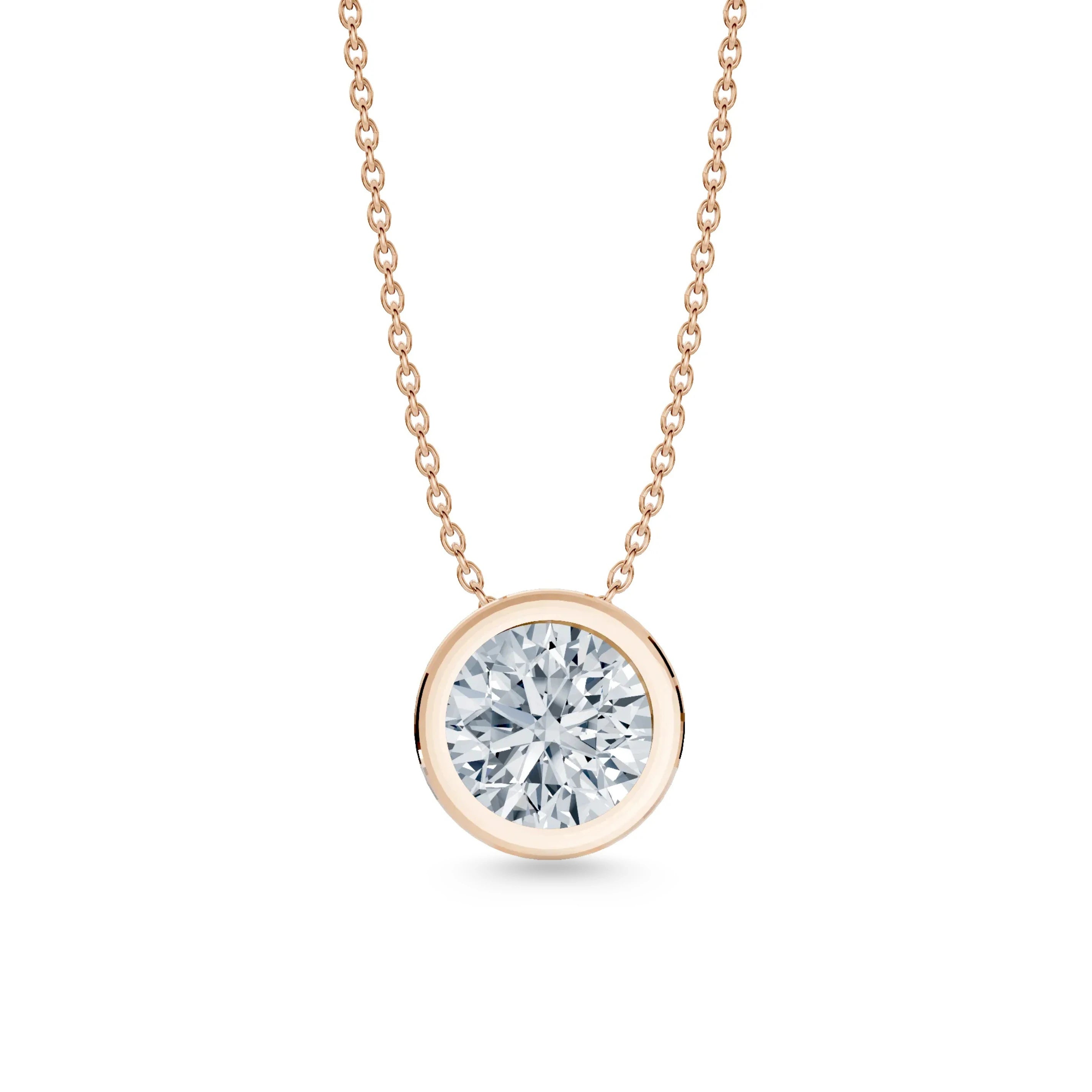 Diese Halskette steht für modernes Understatement und zeitlose Präsenz. Der rund geschliffene Labordiamant wird von einer vollflächigen Zargenfassung umschlossen, die seine klare Form betont und gleichzeitig optimal schützt – eingebettet in feinstes 14 Karat (585er) Roségold.